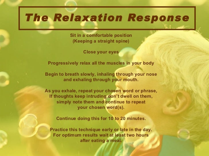 As you exhale say any soothing word or sound silently to yourself. The response is defined as your personal ability to encourage your body to release chemicals and brain signals that make your muscles and organs slow down and increase blood flow to the brain. The Relaxation Response - YouTube.