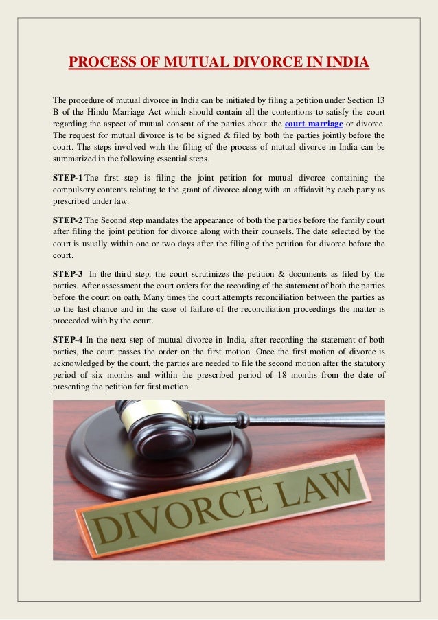 Divorce Procedure in India Stepwise Process to Get Divorce in India. The details of your properties and assets. Section 13-B of the Hindu Marriage Act provides for the couple seeking divorce through mutual consent to wait for a period of six months after making first joint application for divorce.